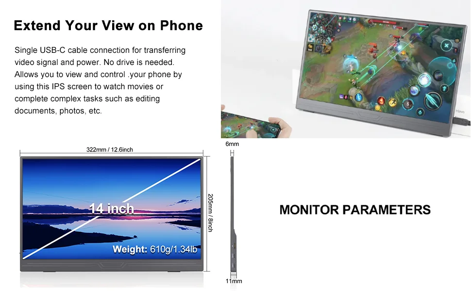 Portable screen with Type-c. HD and USB port make it easy connection with Laptops. PCs. Phones. PS3/PS4. XBOX ONE or Nintendo Switch and Mouse. Keyboard. Great ideal for extending your screen or playing games on business trip, travel or home entertainment.