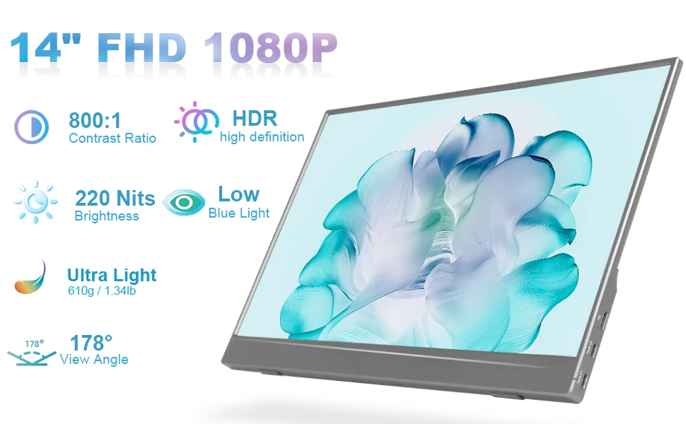 Sibolan 14 inch 1080p Full HD IPS HDR LCD USB Powered Ultra Thin Capacitive Type-c Monitor for Laptop Ps4 Smartphone PC